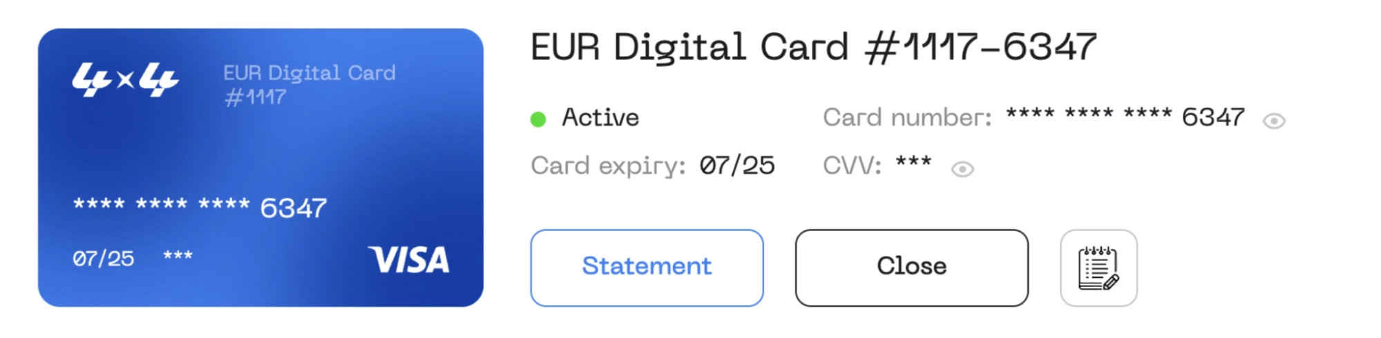 После успешного апрува вы сможете попасть в личный кабинет и выпустить свою первую карту. Как мы уже писали ранее, личный кабинет 4x4.io имеет удобный минималистичный интерфейс. Давайте вкратце рассмотрим ключевые разделы.