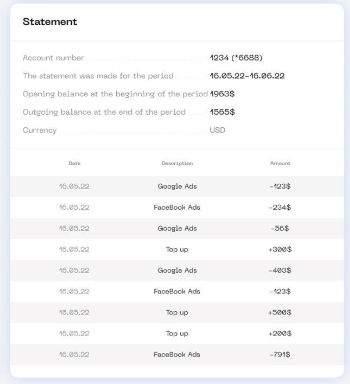 Statements — раздел со списком транзакций, статистикой по расходам и функционалом для формирования отчетов.