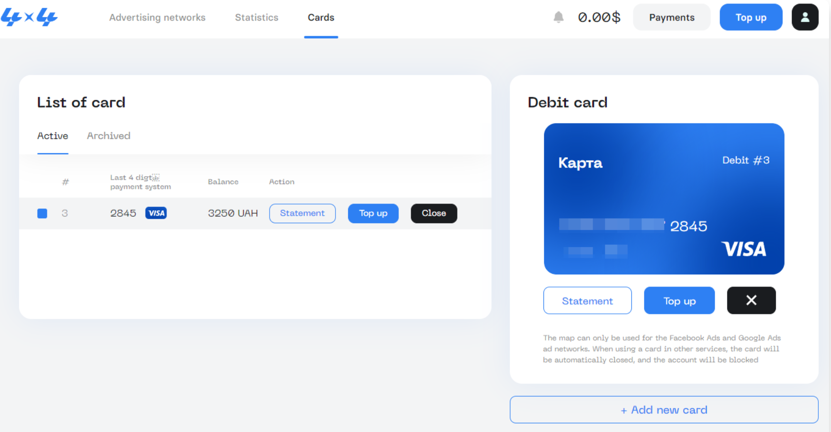4x4.io — популярный среди арбитражников сервис выпуска виртуальных карт от 4x4 Agency. Работает с 2022 года, оптимизирован под работу с популярными рекламными кабинетами. Предлагает неплохие условия в частности невысокие комиссии и детальную аналитику. Использовать карты для повседневных расходов нельзя, 4x4.io работает исключительно с рекламой.