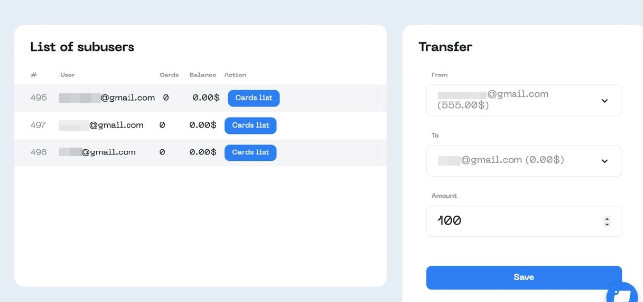 - Командный функционал — мастер-аккаунт может приглашать новых участников, распределять должности и права доступа для совместного управления балансом и картами.