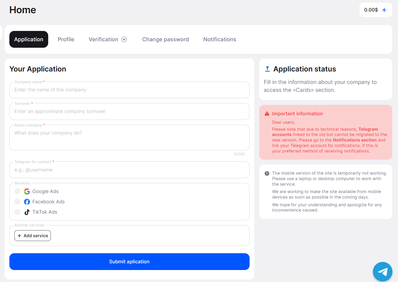 - После авторизации вам предложат заполнить еще одну форму. Даже несмотря на то, что она ориентирована на компании, вы можете ввести данные от лица соло-арбитражника. Главное — укажите правильный контакт в Telegram.