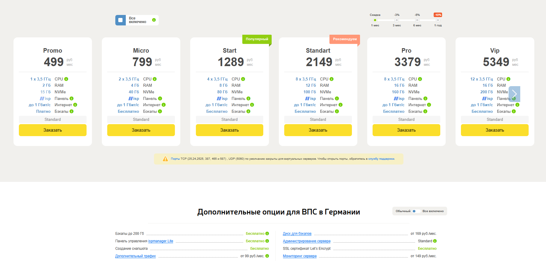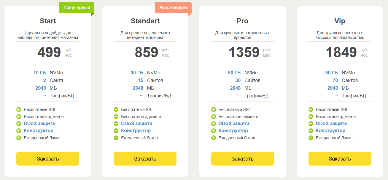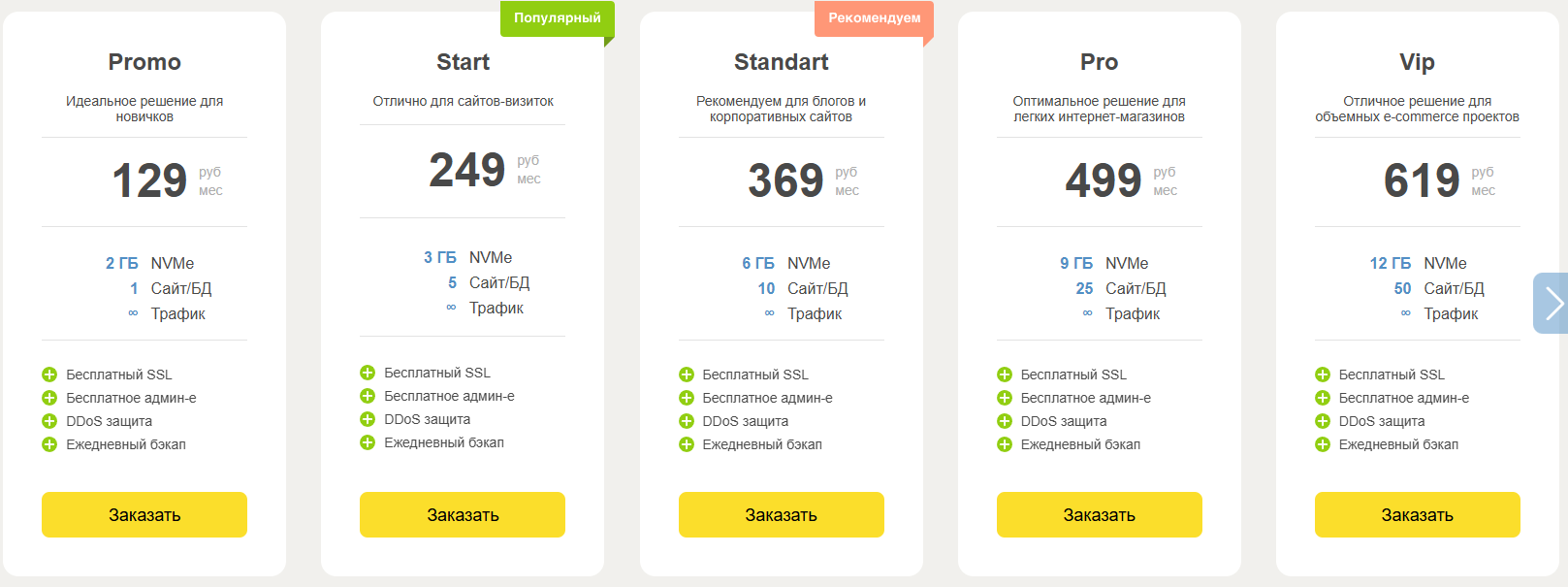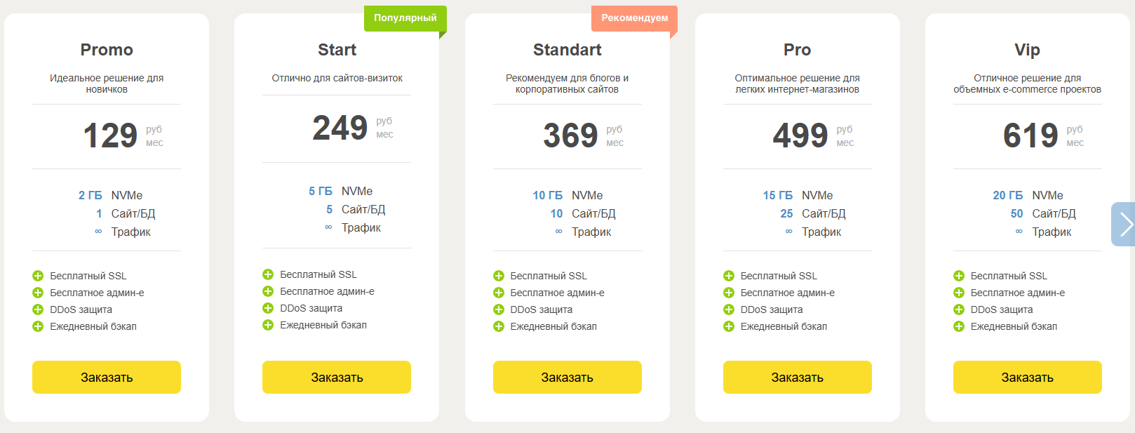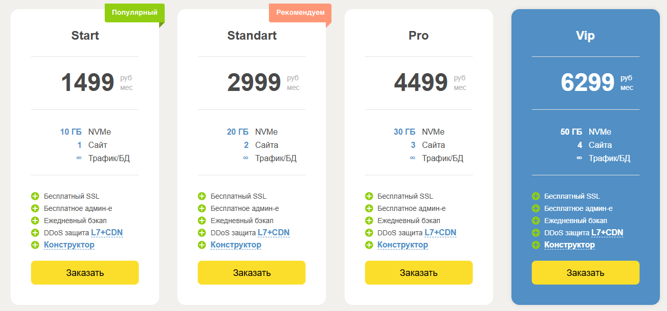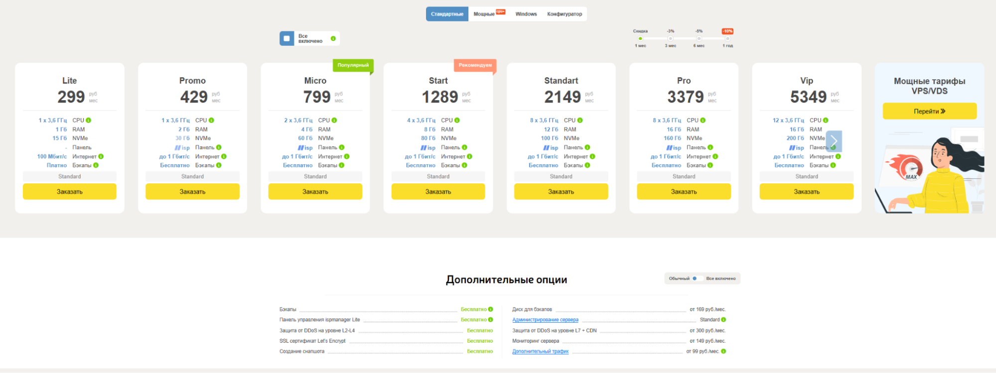 Стандартные тарифы на сервера в РФ начинаются с 299 руб. в месяц (без учета дополнительных платных опций):