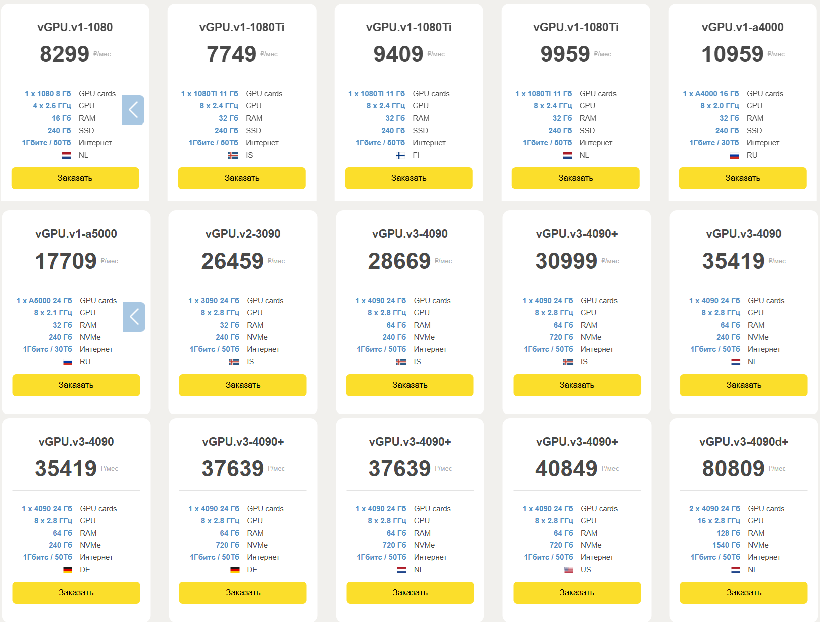 Отдельная, можно сказать особая услуга, которую предлагают далеко не все хостинг-провайдеры — это VPS с GPU (видеокартой). Сервера работают в РФ, Нидерландах, Исландии, Финляндии, Германии и США. На выбор доступны как классические видеокарты (GTX 1080, GTX 1080ti, RTX 3080, RTX 3090, RTX 4090), так и специализированные (RTX A4000, RTX A5000, RTX A6000).