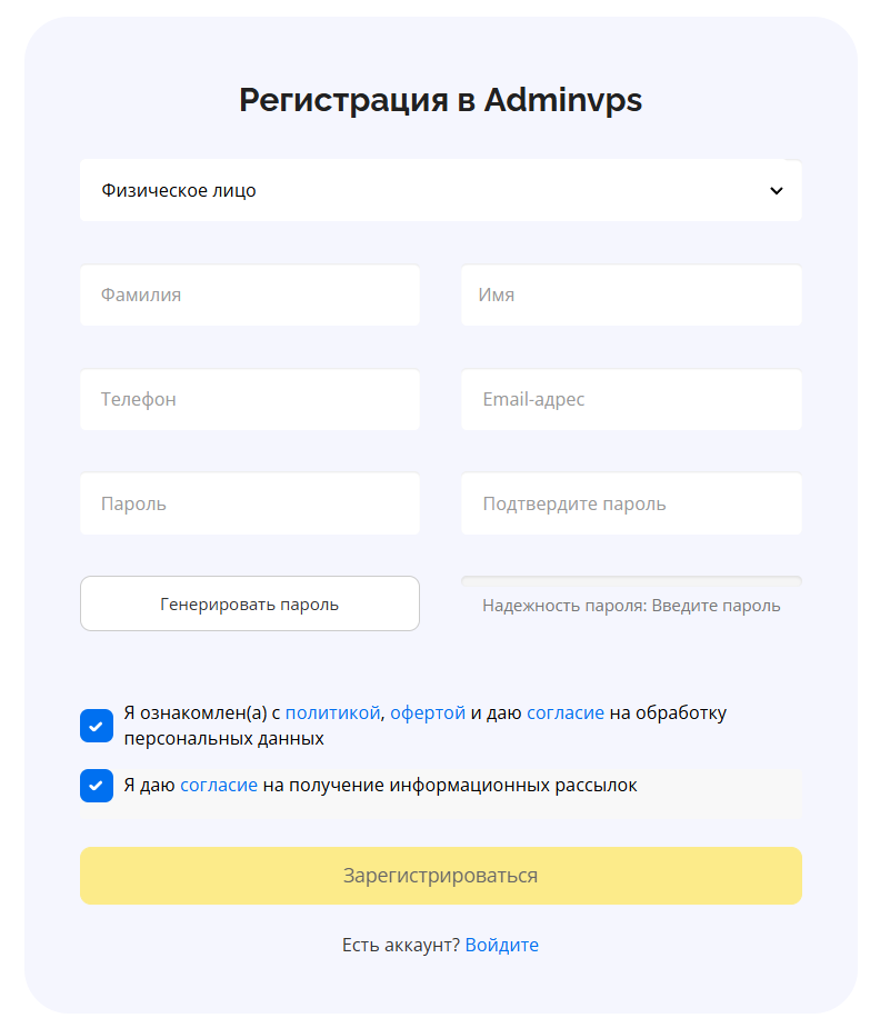 Для пользования некоторыми услугами (например для регистрации домена) AdminVPS требует подтвердить ФИО, поэтому при регистрации важно ввести корректные данные.