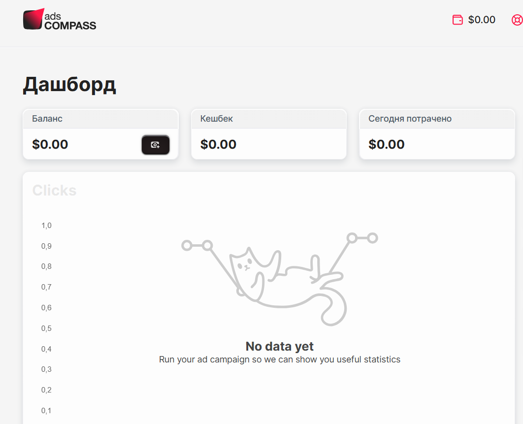 Это главная страница, на которой публикуется основная информация: баланс, данные по кликам, сумма выручки и количество показов.