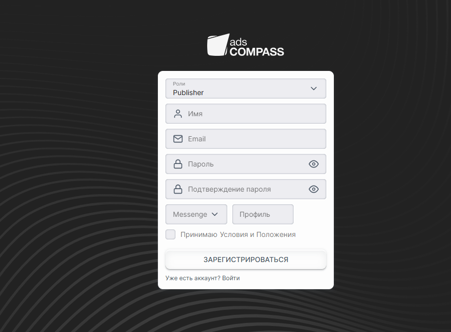 Чтобы приступить к работе с рекламной сетью AdsCompass, нужно зарегистрироваться на официальном сайте. Сначала вам нужно будет указать роль: рекламодатель или вебмастер. В зависимости от этого функционал аккаунта будет меняться. Затем от вас требуется указать имя, e-mail, пароль и ник в соцсетях, например, в Telegram.