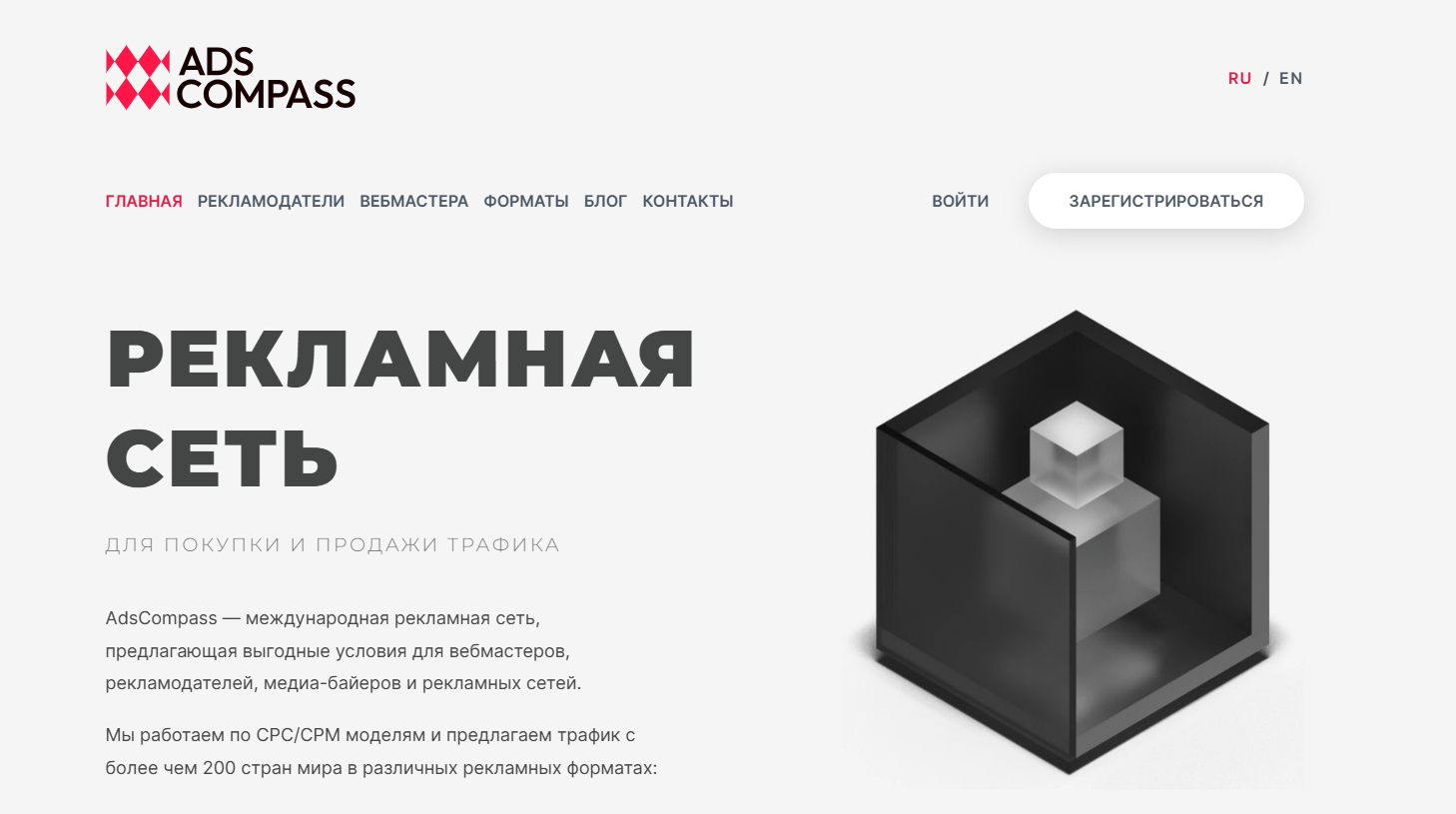 AdsCompass — это международная рекламная сеть, работающая с 2013 года и предлагающая своим партнерам трафик с 200+ стран в разных рекламных форматах. Компания сотрудничает с рекламодателями, медиа-байерами, вебмастерами и другими рекламными сетями. AdsCompass предлагает RTB-платформу, гибкие настройки в аналитике и многое другое, чтобы покупка и продажа трафика была удобной и профитной.