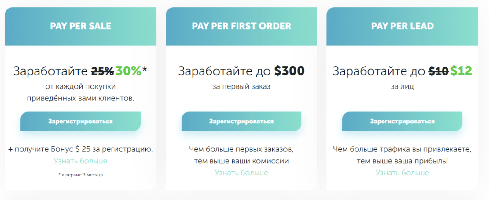 - Revenue Share (25% - 30% за каждую покупку приведенного юзера) + $25 регистрационный бонус;
