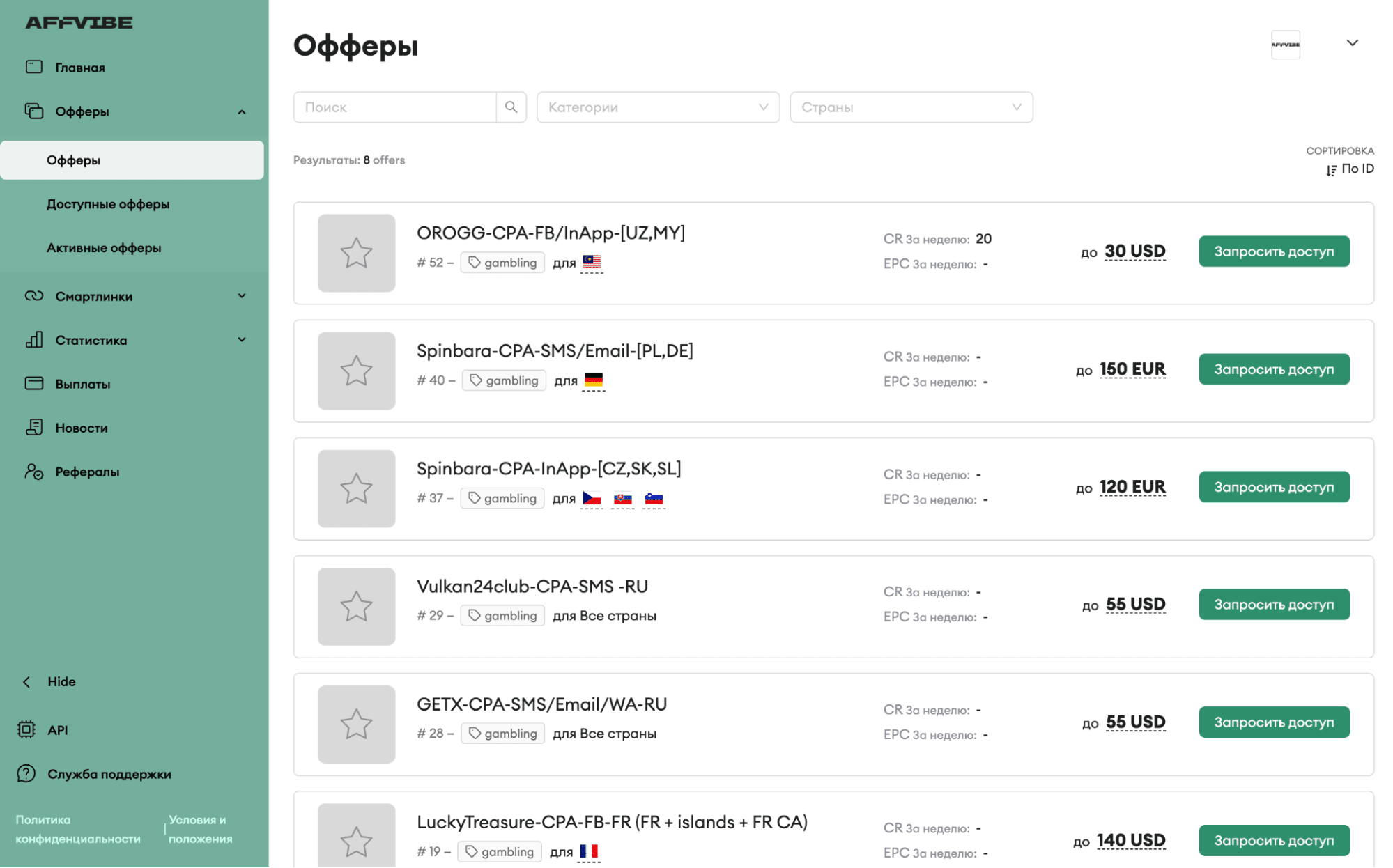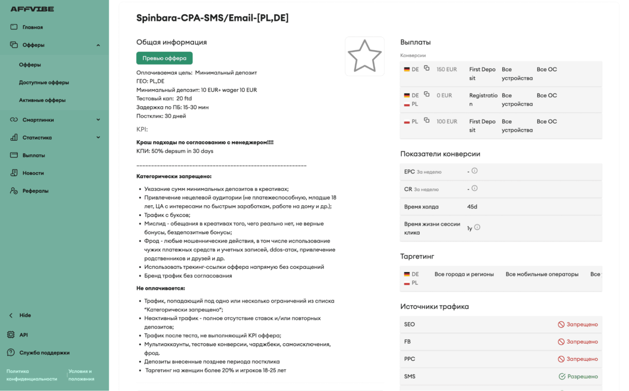 «Офферы» — раздел со всем, что касается офферов партнерской программы Affvibe Partners: каталог, условия, доступные офферы, активные офферы и т. д.