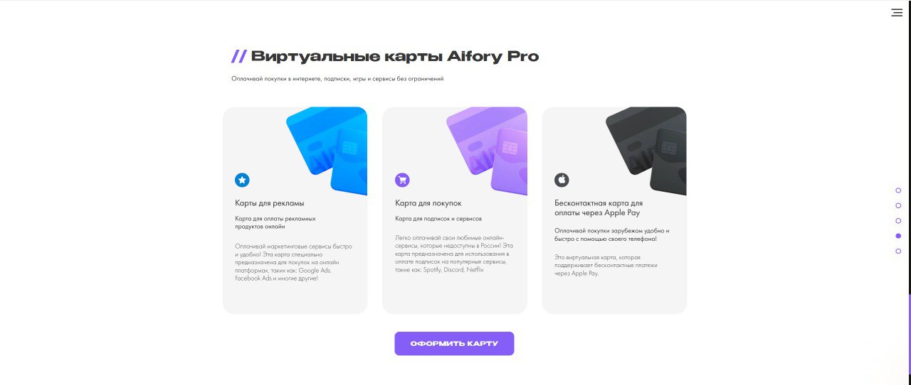 Aifory Pro — это современный сервис выпуска виртуальных карт, который отлично закрывает потребности в оплате популярных зарубежных сервисов, игр и подписок, предлагая покупки в интернете без ограничений по всему миру. Кроме того, сервис позволяет удобно и быстро оплачивать покупки за рубежом с помощью смартфона благодаря поддержке бесконтактных платежей через Apple Pay. Также платформа предоставляет специализированные решения для digital-маркетинга и арбитража трафика — карты, специально предназначенные для комфортной оплаты рекламных кабинетов на таких онлайн-платформах, как Google Ads, TikTok и Facebook.