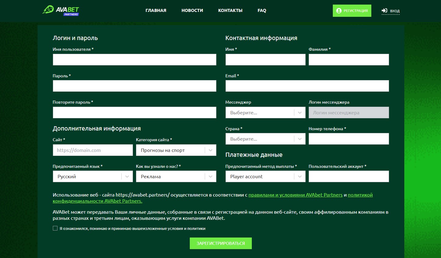 Регистрация в AVAbet Partners