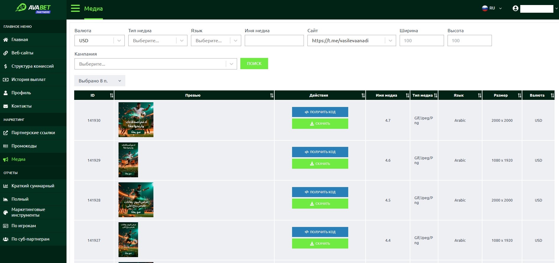 Медиа — в этой вкладке размещены рекламные материалы для работы: баннеры различных размеров на английском и арабском языках, а также HTML-коды для интеграции на сайт. При необходимости можно запросить эксклюзивные креативы у менеджера.