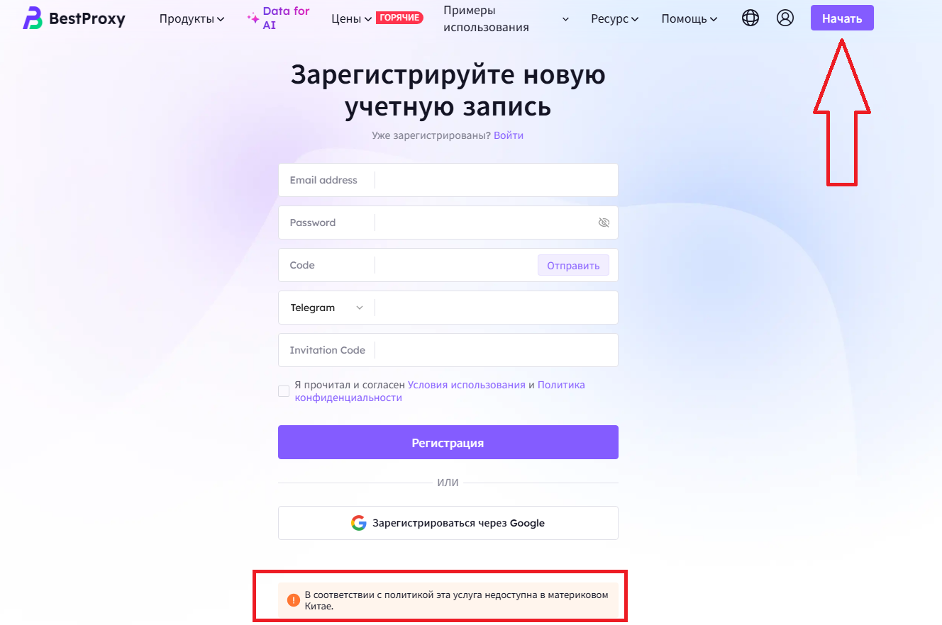 Регистрация в BestProxy занимает считанные минуты и доступна из любой точки планеты кроме материкового Китая. Достаточно перейти на сайт сервиса и нажать кнопку «Начать» в правом верхнем углу.
