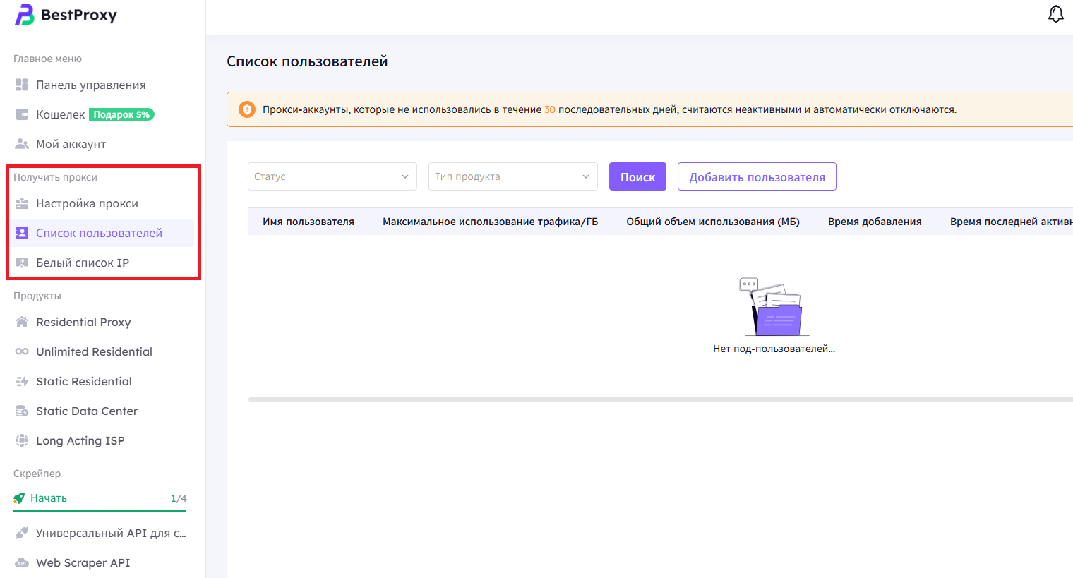 Раздел Получить прокси приведет вас с меню Настройки прокси, в меню управления Списками пользователей и в меню Белого списка IP.