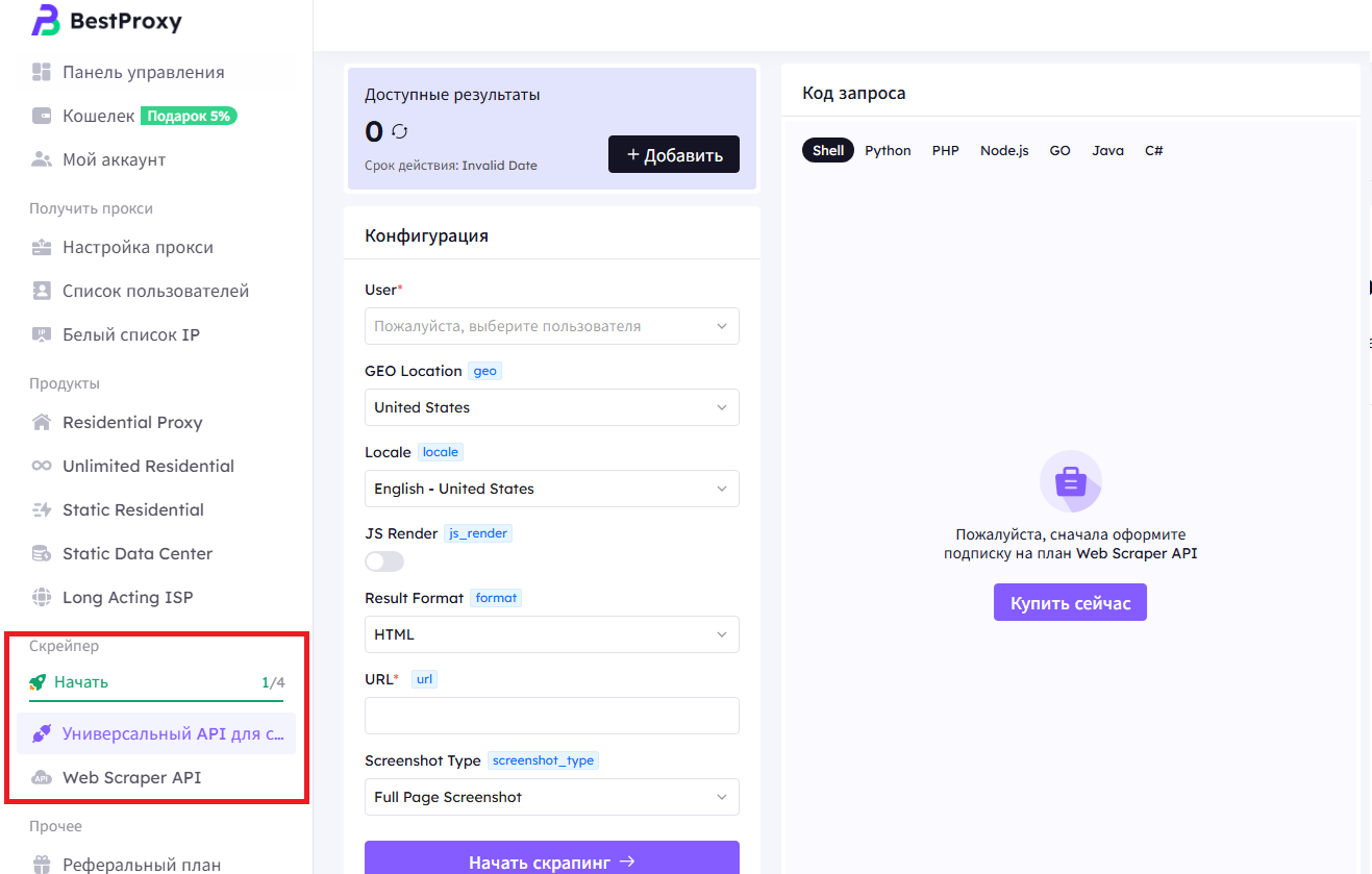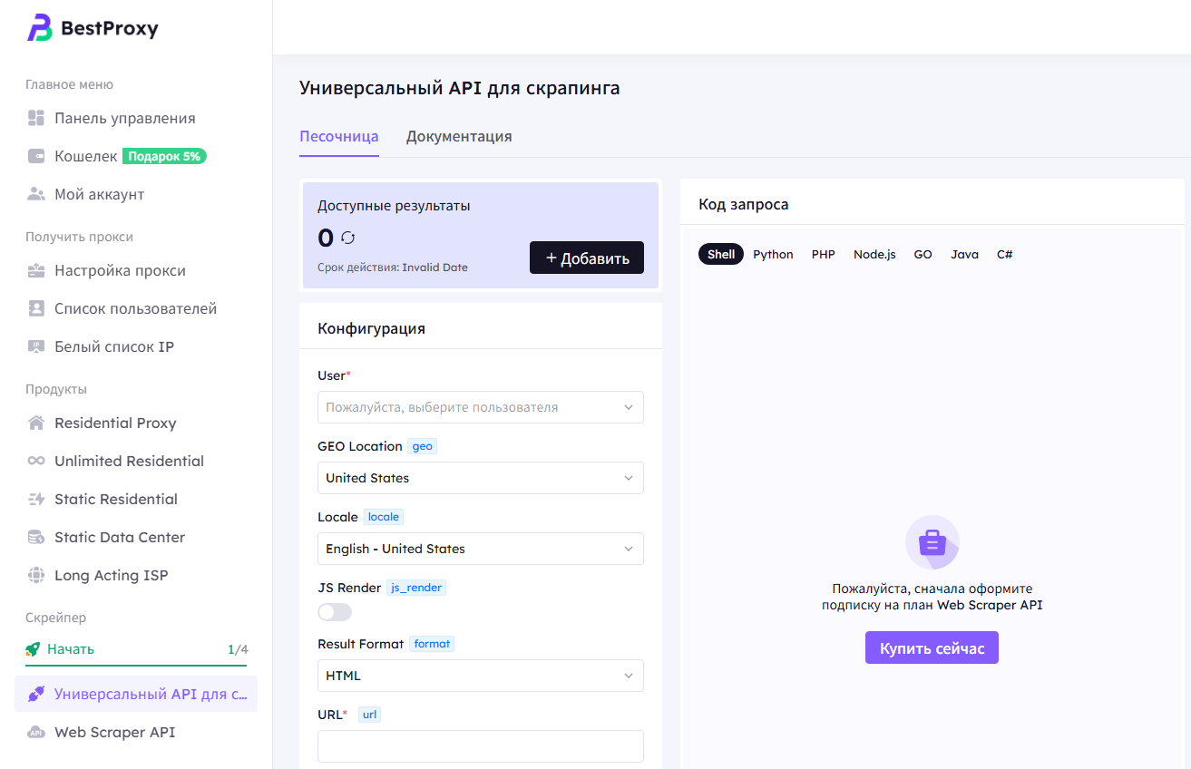 После регистрации вы окажитесь в Панели управления, имеющий 2 вкладки — прокси и API веб-краулеры.