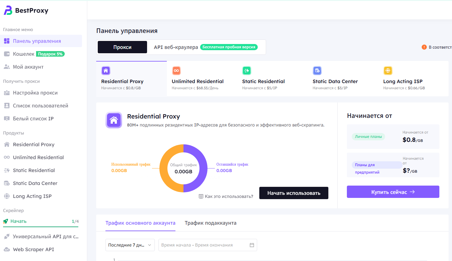 - Ротационные резидентские прокси — от $0,8/GB. Включают в себя таргетинг по ГЕО, поддержку HTTP/SOCKS5 и uptime до 99,5%.