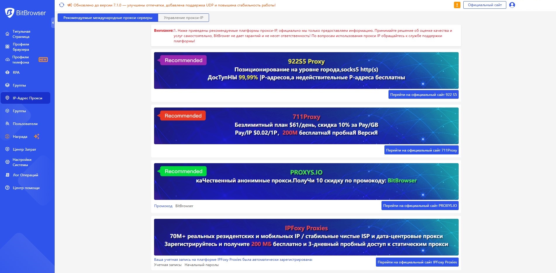 В этой вкладке перечислены прокси, рекомендуемые создателями антидетект-браузера. При этом разработчики уточняют, что не берут на себя ответственность за качество услуг прокси, а просто предоставляют информацию.