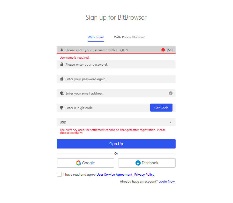 После установки антидетект-браузера потребуется создать учетную запись. Регистрация стандартная — нужно ввести e-mail, имя пользователя и пароль, а затем подтвердить аккаунт кодом из письма. При регистрации важно указать, в какой валюте вы работаете — доллар или китайский юань.