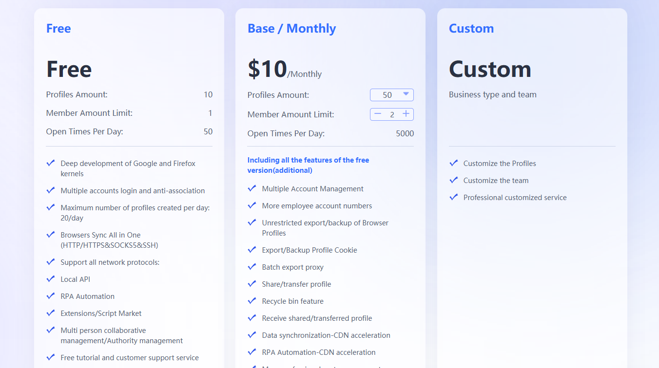 У BitBrowser есть три тарифа — Free, Base и Custom.