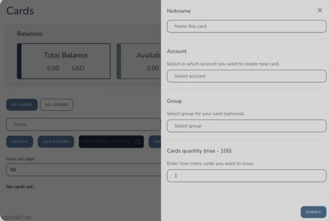 Далее, что нам нужно — меню выпуска карт в разделе Cards. Здесь необходимо указать название, лимиты, выбрать команду (в случае использования командного функционала) и необходимое количество.