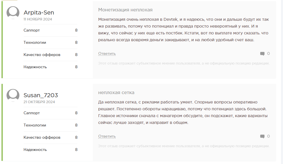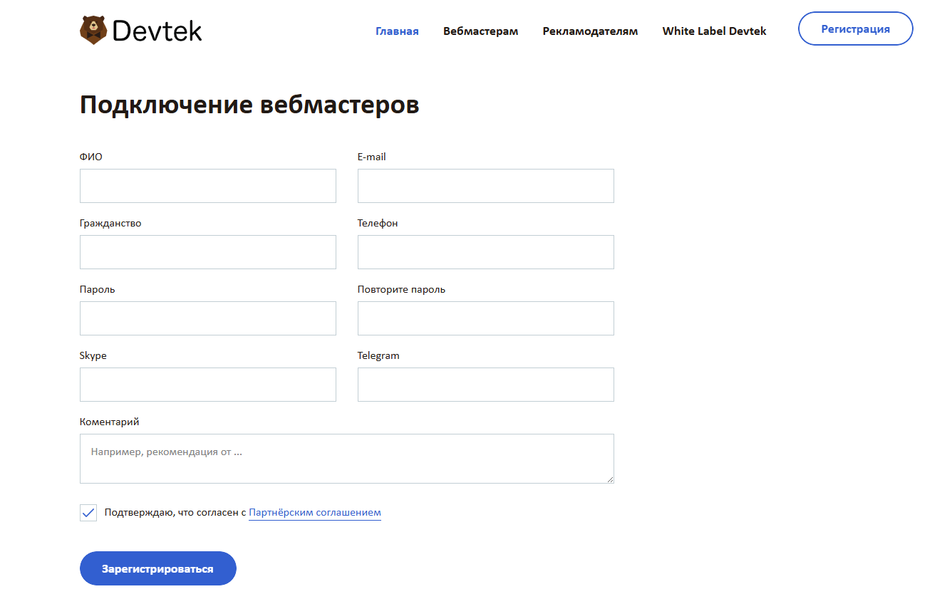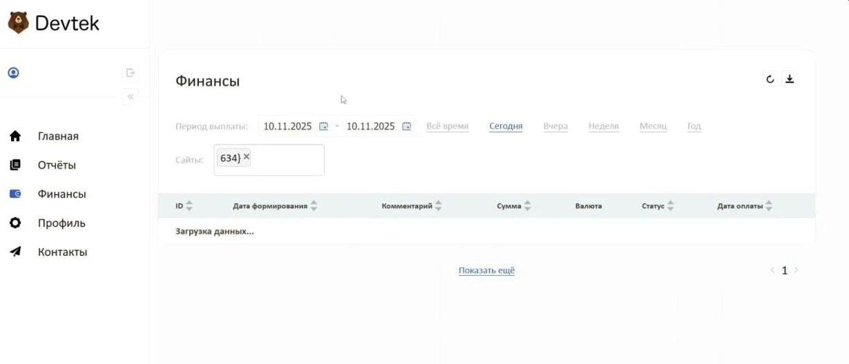 Ключевая особенность Devtek — закрытая модель работы. В партнерской сети нет публичного каталога офферов: не раскрываются рекламодатели, ставки и объёмы.