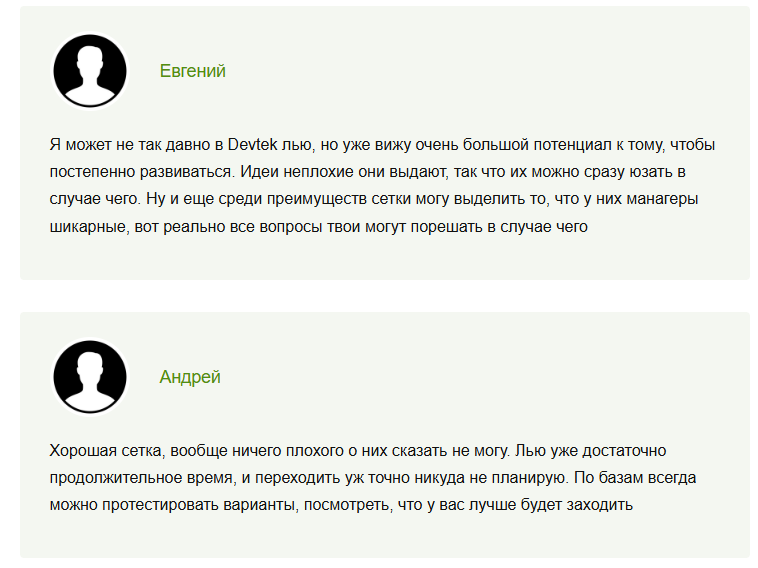 Devtek работает по модели RevShare — партнёр получает процент от дохода, который генерирует переданный трафик.