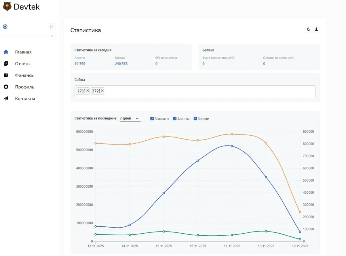 Платформа ориентирована на команды с опытом, которые понимают специфику финсегмента и умеют работать с объёмами и качеством данных. Devtek взаимодействует как с веб-мастерами, так и с рекламодателями, но в этом обзоре фокус сделан на стороне арбитражников и практическом опыте работы с сетью.