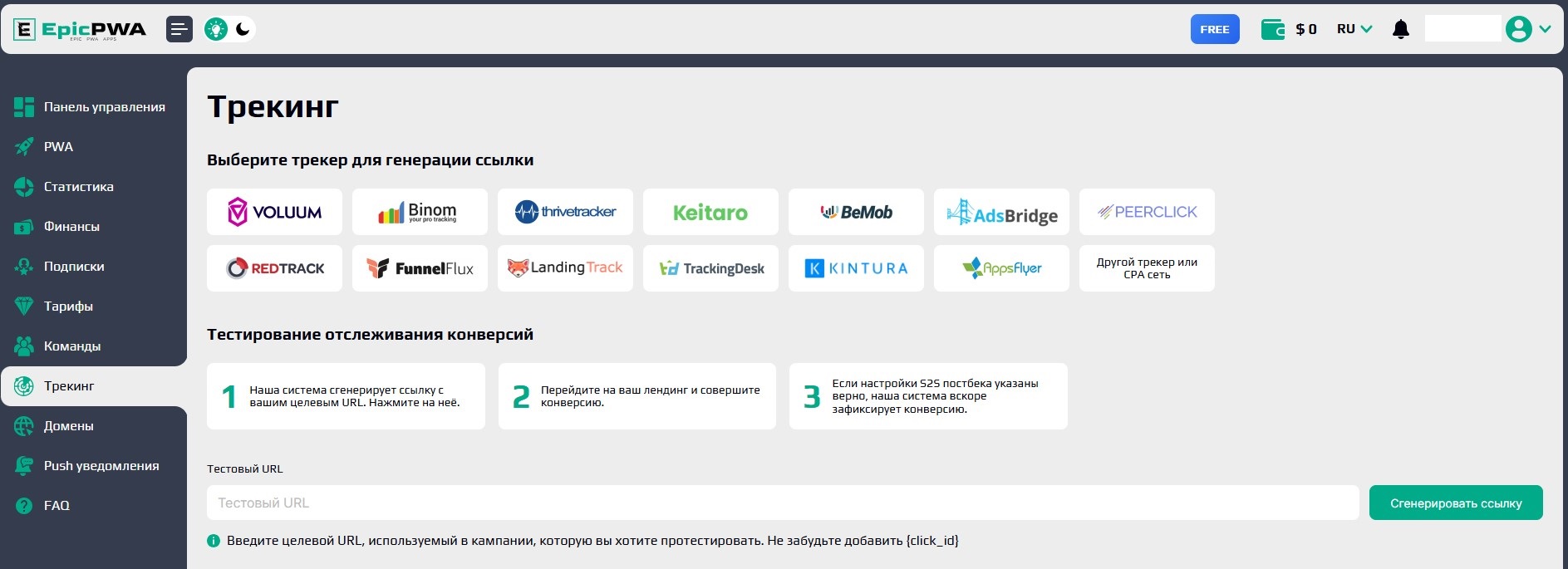 Здесь вы можете выбрать трекер и настроить корректное отслеживание конверсий.