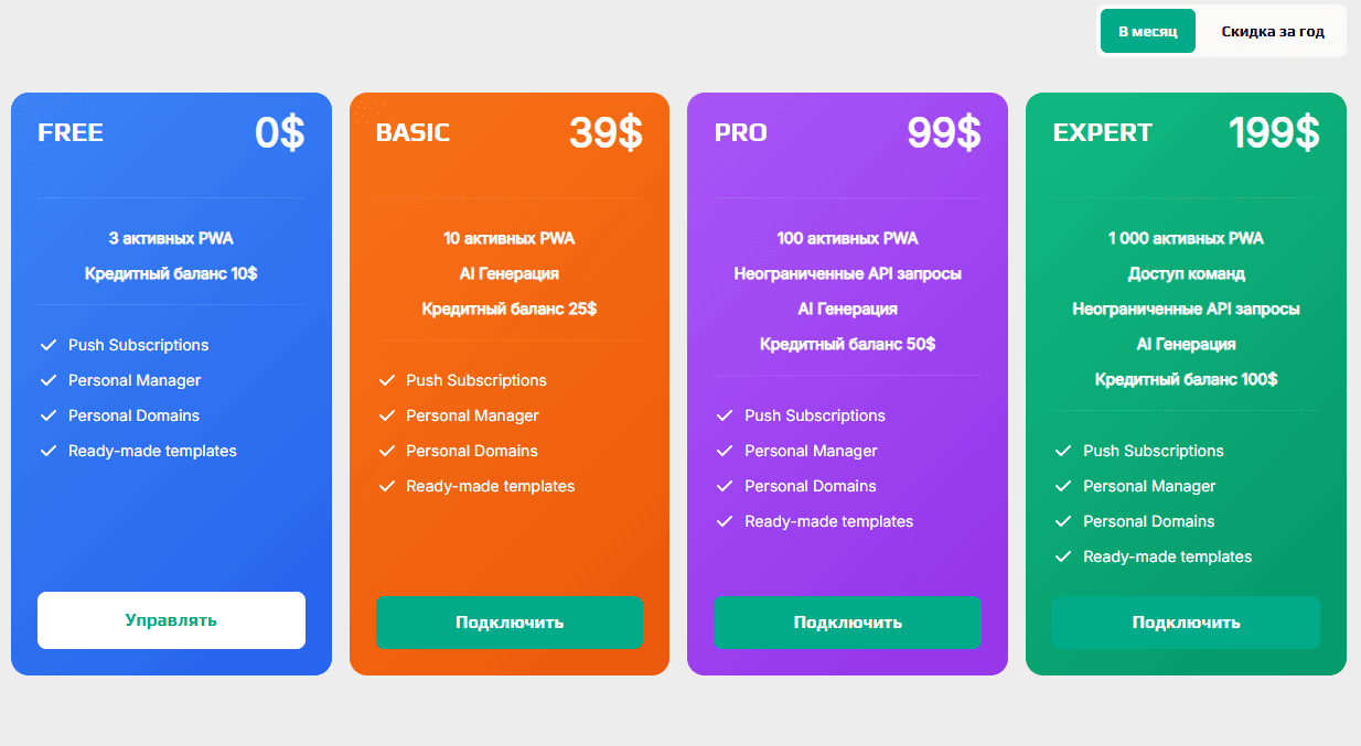 При покупке одного из платных тарифов — Basic ($39 в месяц) или Pro ($99 в месяц) — у вас расширится число доступных к созданию прил (10 или 100 прил соответственно), появится возможность ИИ-генерации и увеличится кредитный баланс ($25 и $50 соответственно). Если же вы выберете тариф Expert ($199 в месяц), то получите доступ к командному режиму и 1000 PWA.