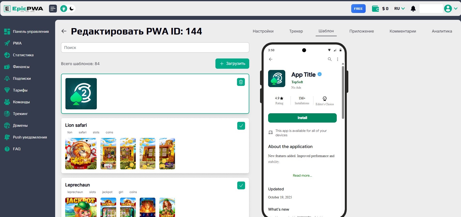 В этом разделе вы можете создать свои PWA-приложения. Вся работа займет не больше нескольких минут, вы можете вручную настроить основные параметры прилы (название, категорию, домен), визуальное оформление (с предпросмотром), ГЕО трекинг, клоакинг и прочее. Здесь же вы можете сразу выбрать готовый шаблон для прилы.