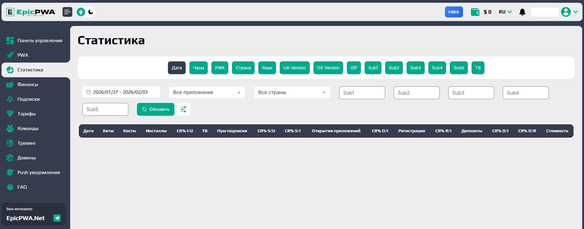 Здесь можно посмотреть стоимость одной установки PWA. Информация фильтруется по типу подписки и ГЕО.