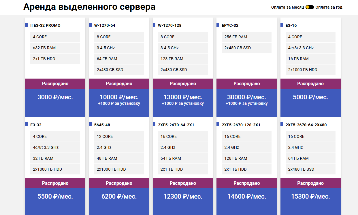 Дата-центр компании расположен в Москве. Стоимость тарифов варьируется в зависимости от числа ядер, объема оперативки, мощности процессора и параметров диска. Сейчас все тарифы распроданы.