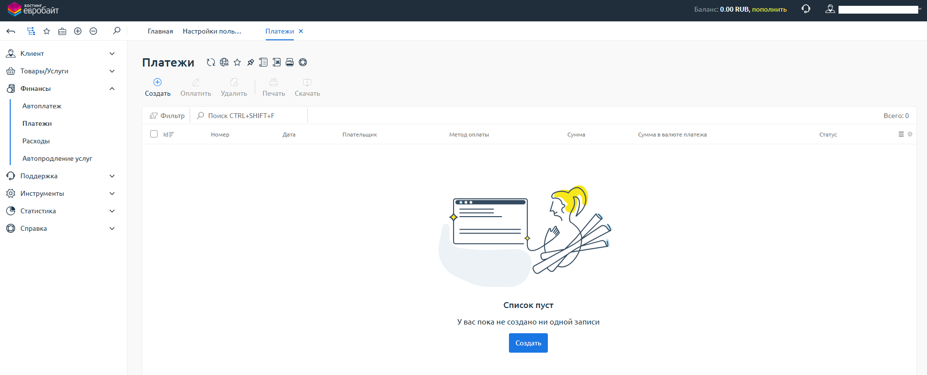Это раздел, в котором содержится информация о всех финансовых платежах на сервисе. Здесь можно посмотреть историю выплат, настроить автоплатежи и создать новые запросы на оплату услуг.