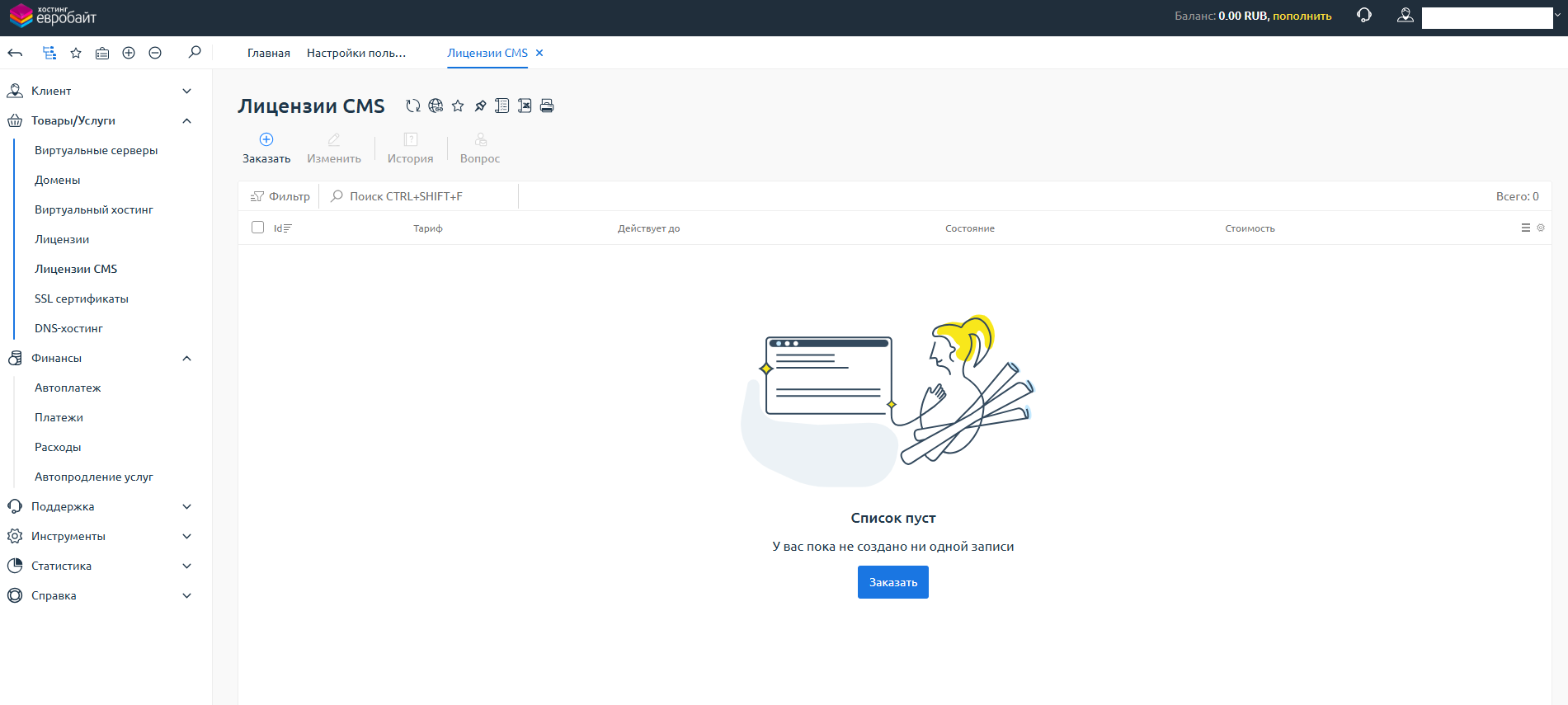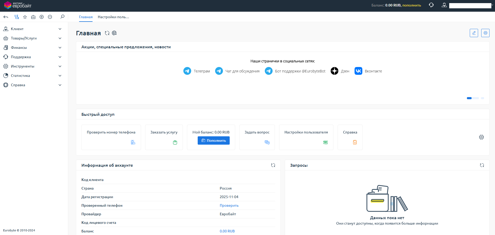 Это основная страница, которая автоматически открывается при входе в личный кабинет. Здесь показана информация о балансе, данные о пользователе. Также в этом разделе можно заказать услугу, подкорректировать персональные сведения и задать вопрос саппорту.
