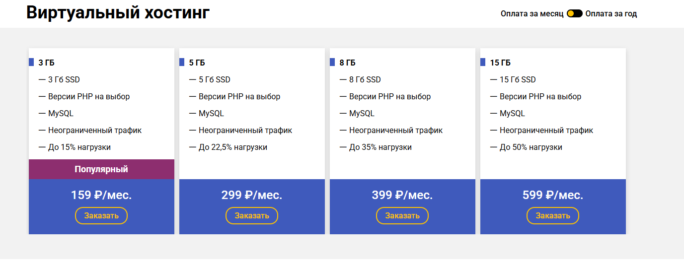 «Eurobyte» предлагает 4 тарифа, различающихся объемом SSD-хранилища и допустимым уровнем нагрузки. Каждый вариант включает неограниченный трафик, безлимитное число доменов, баз данных и e-mail адресов, а также бесплатный SSL-серт.