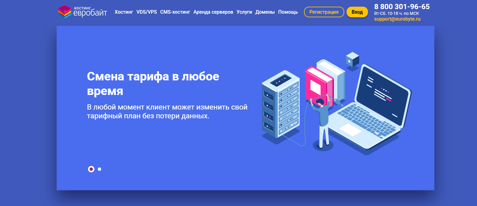 «Eurobyte» — хостинг-провайдер, который предлагает аренду выделенных серверов, покупку доменов и различные виды хостинговых услуг. Он работает с 2010 года, а его дата-центры с современным оборудованием расположены в Москве и в Нидерландах. Провайдер поддерживает разнообразные способы оплаты и предоставляет неограниченный трафик для всех клиентов.