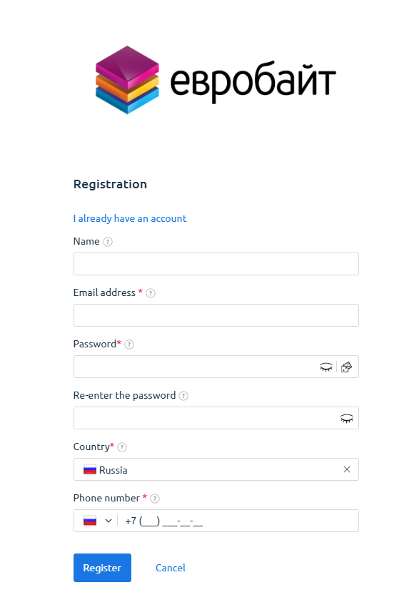 Чтобы начать пользоваться услугами сервиса «Eurobyte», нужно зарегистрироваться на официальном сайте. Сначала надо выбрать услугу и тариф, затем дата-центр и период оплаты (за месяц или год). Затем появится форма регистрации, где надо указать имя, e-mail, пароль, страну и номер телефона.