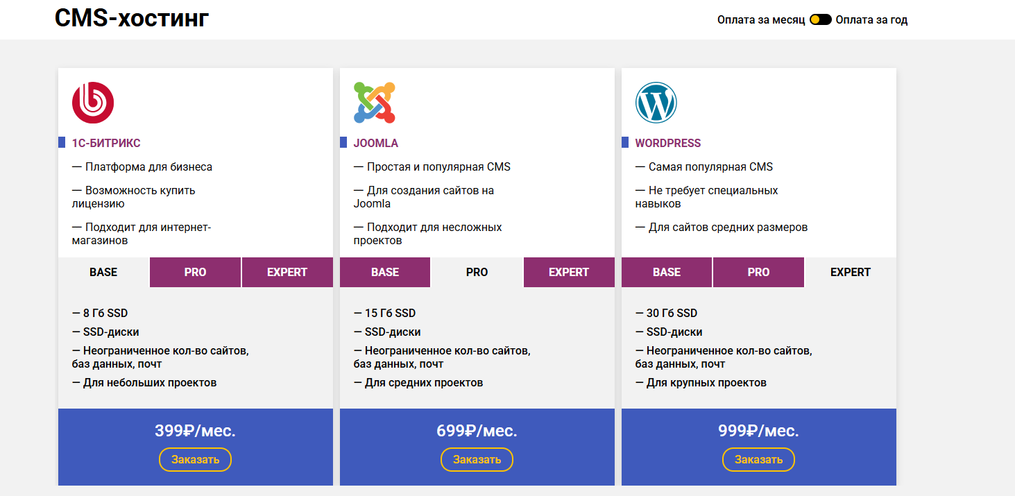 Хостинг-провайдер «Eurobyte» поддерживает работу с любыми CMS, а при необходимости по индивидуальному запросу может установить и другую систему управления сайтом. В настоящее время доступны три тарифных плана — с объемом SSD-хранилища 8, 15 и 30 ГБ. Во всех CMS-тарифах предусмотрено неограниченное количество сайтов и баз данных.