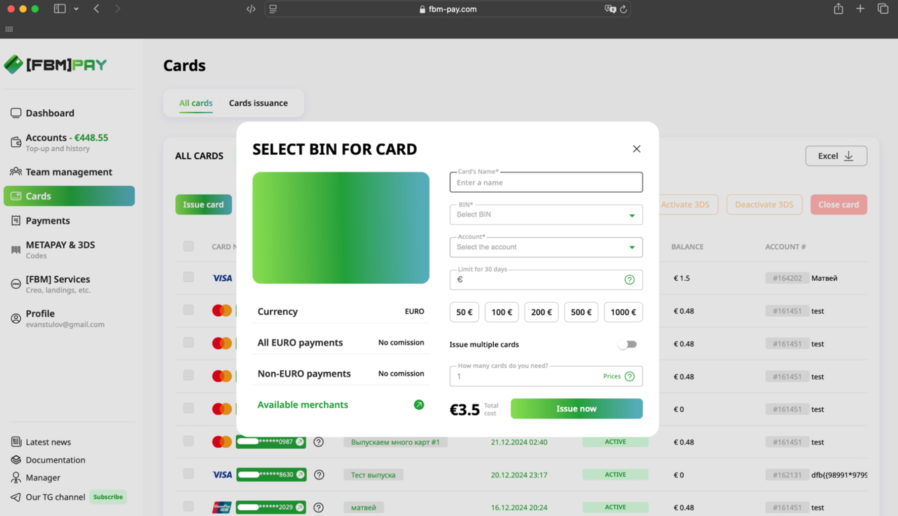 - Выпустить карту вы можно в разделе Cards. Для этого необходимо задать название, выбрать BIN, счет, назначить лимиты и указать количество — [FBM] PAY позволяет создать до 10 карт за раз.