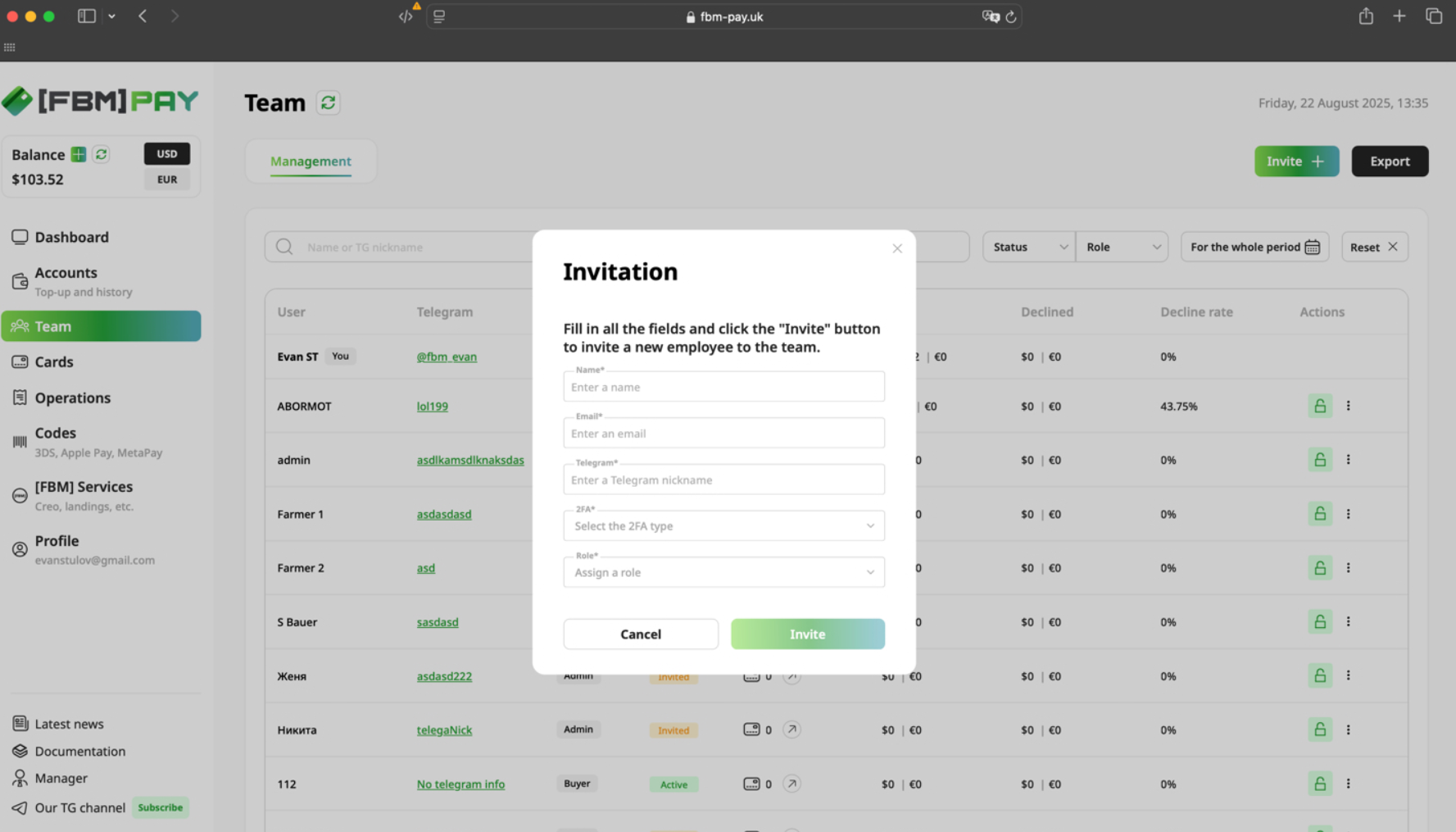 - Раздел Team Management предназначен для работы с командным функционалом. Чтобы пригласить нового участника, введите его имя, email-адрес, контакт в Telegram и выберите одну из доступных ролей (Owner, Admin или Buyer). [FBM] PAY позволяет устанавливать лимиты на спенд для каждого отдельного сотрудника, а также приостанавливать их работу.