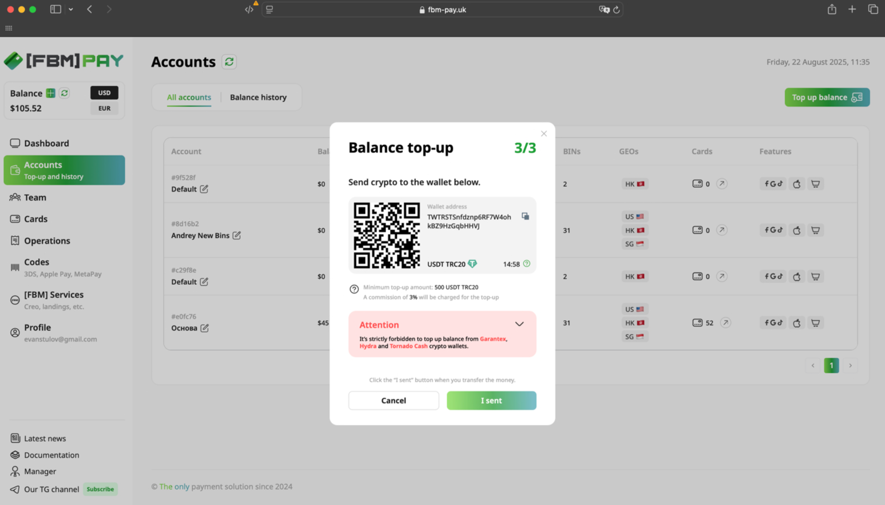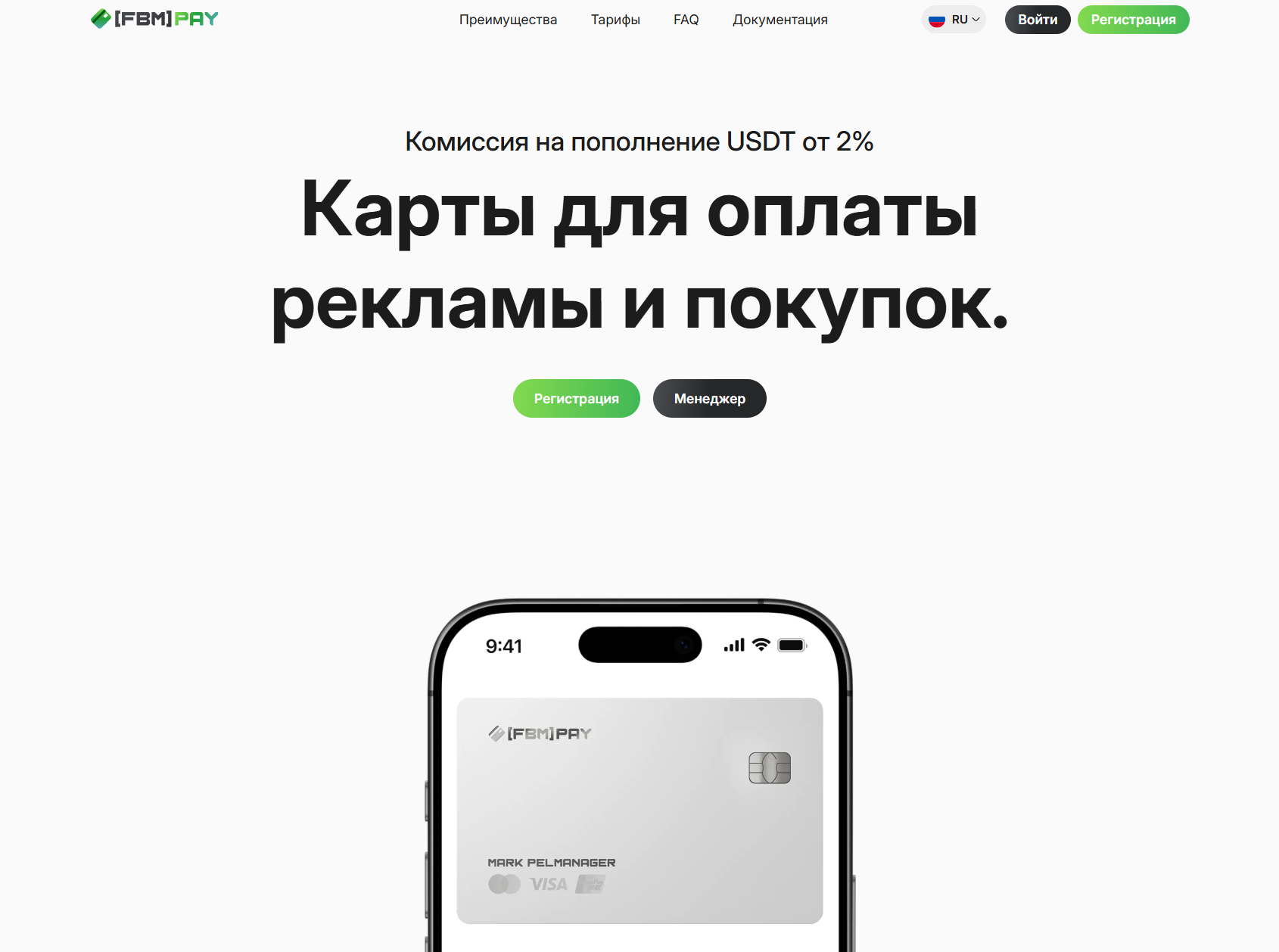[FBM] PAY — сервис выпуска виртуальных карт, ориентированный на арбитражные команды и соло-арбитражников. Предоставляет качественные бины, адаптированные под самые популярные рекламные кабинеты. [FBM] PAY популярен и среди обычных пользователей, для которых виртуальные карты — это инструмент оплаты повседневных расходов (в частности покупок в интернете, авиабилетов, оплаты отелей и многого другого).