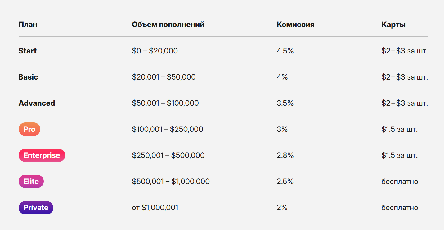 Баланс можно пополнять в крипте, KYC-верификация не обязательна. Цены на карты — одни из самых низких в нише, помимо этого радует отсутствие большинства комиссий и абонплаты. Карты от [FBM] PAY удобны и для повседневных расходов — просто подвяжитесь к Apple Pay и тратьте свои деньги на что угодно. Минимальное пополнение — $500.