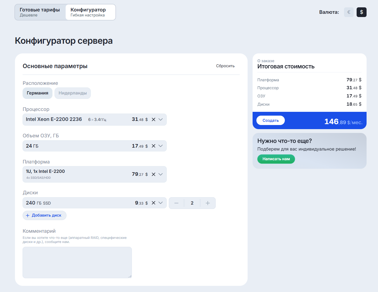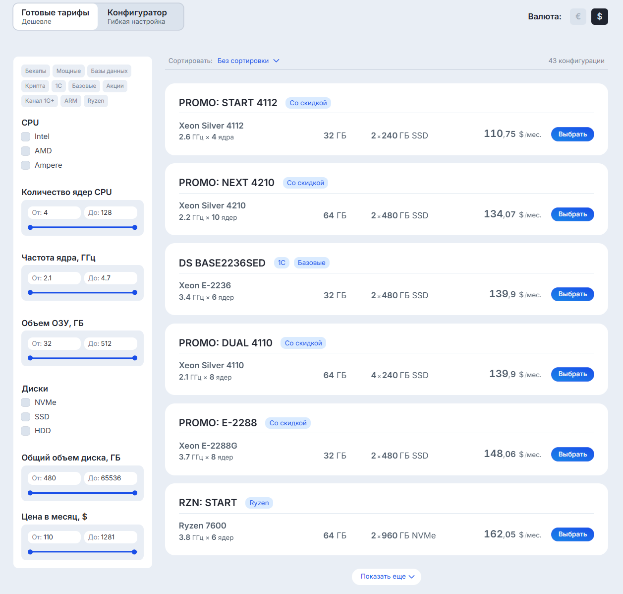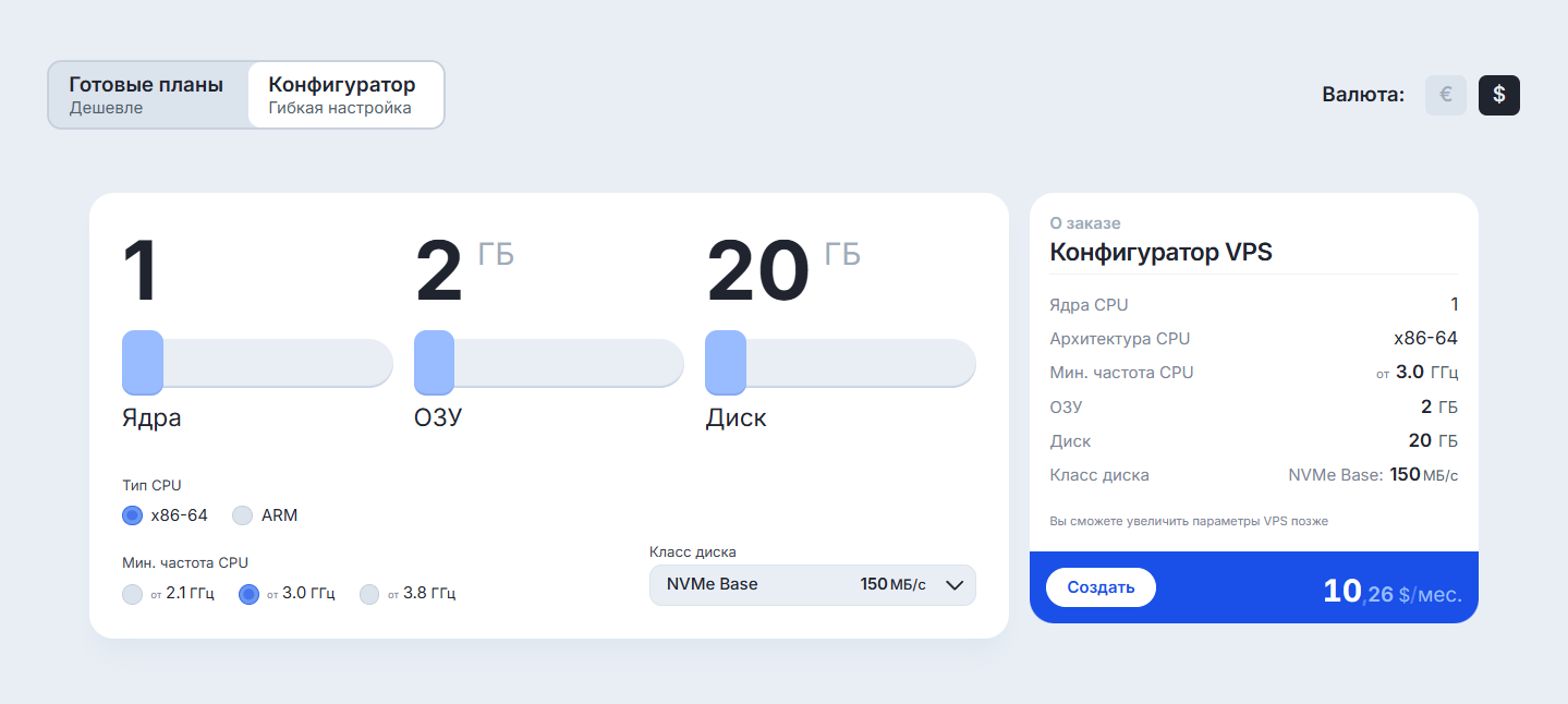 В конфигураторе VPS вы можете выбрать любые подходящие для вас характеристики железа. Цена напрямую зависит от мощности отдельных комплектующих. Поиграться с настройками и подобрать нужную конфигурацию можно вот здесь.