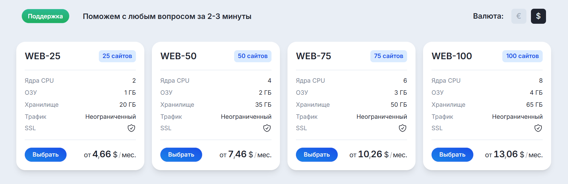 - Виртуальный хостинг — пространство для сайта любой сложности с неограниченным трафиком и скоростными NVMe SSD.