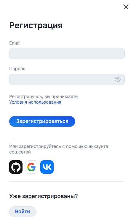 Регистрация у провайдера FORNEX проходит пару кликов (можно ввести адрес почты и пароль, либо зарегистрироваться через аккаунты GitHub, Google или VK).