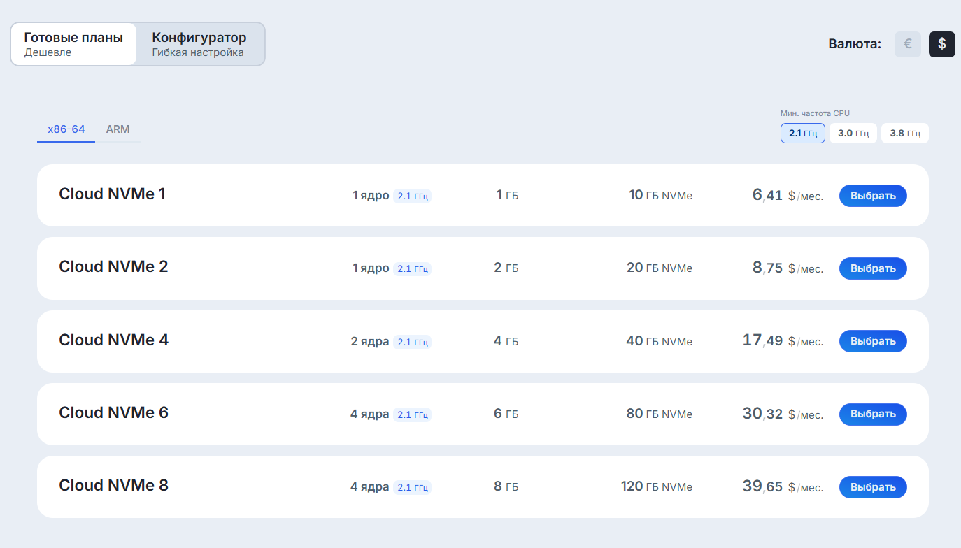 FORNEX предлагает на выбор несколько готовых конфигураций VPS с возможностью выбора частоты процессора и его архитектуры (ARM или x86-64). Более детально — вот здесь.