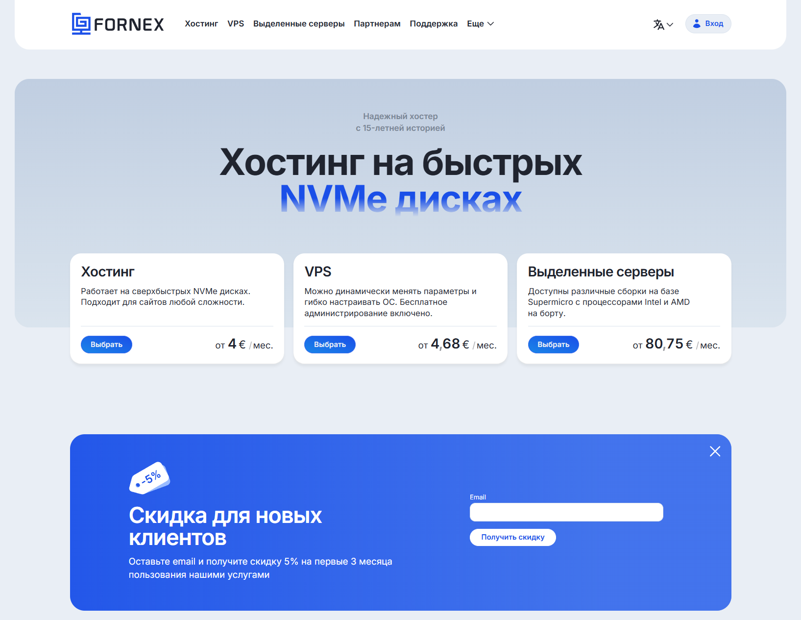 FORNEX — это проверенный временем европейский провайдер хостинг-услуг который пдоступен для пользователей со всего мира. На рынке вот уже более 15 лет. Специализируется на виртуальных, выделенных и облачных серверах, а также хостингах для сайтов. Цены у FORNEX довольно приятные, качество услуг также на высоком уровне. Компания регулярно модернизирует собственную инфраструктуру и следит за безопасностью ваших данных.