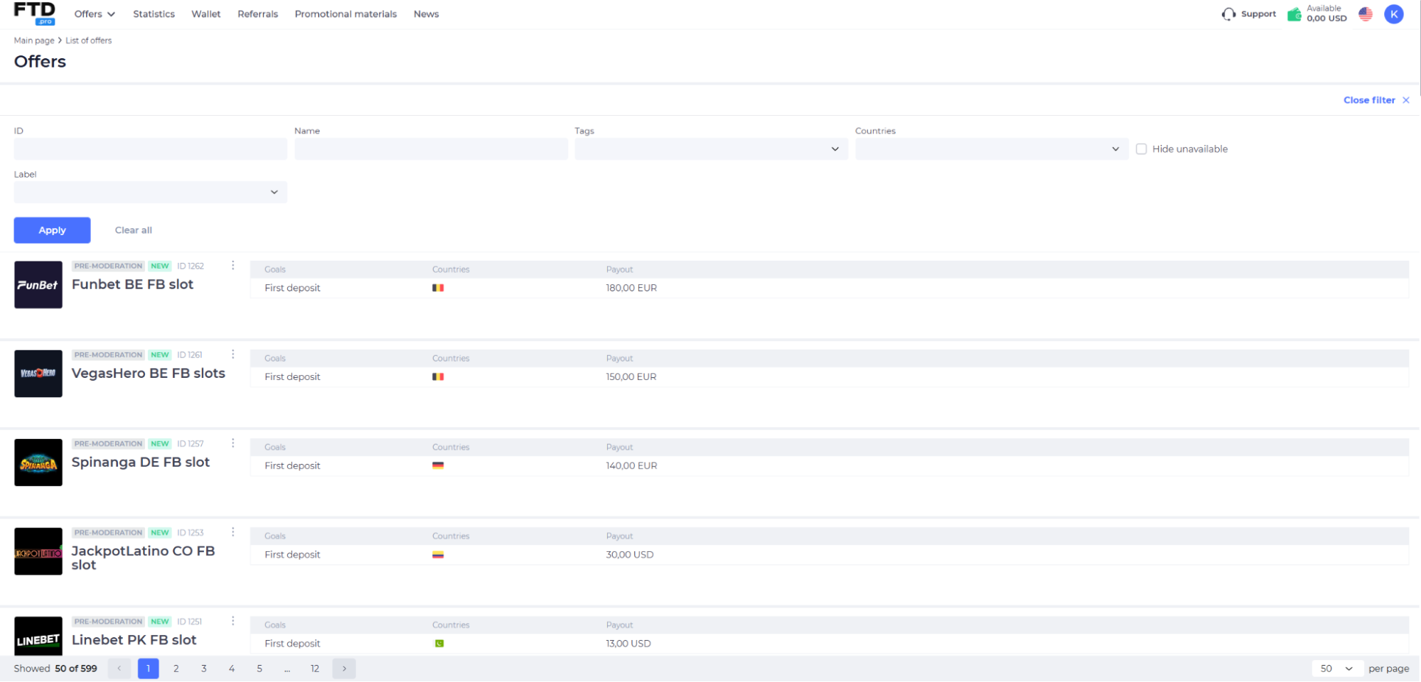 Первый раздел, на который стоит обратить внимание — Offers. Он, как вы уже поняли, включает в себя список всех офферов CPA-сети с возможностью поиска по заданным параметрам.