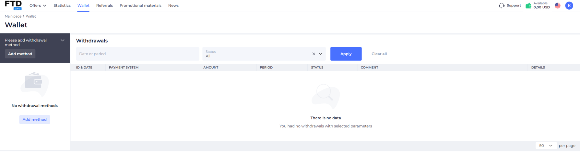 Еще один не менее важный для веб-мастера раздел — Wallet, позволяющий добавлять платежные методы для вывода заработанных средств.