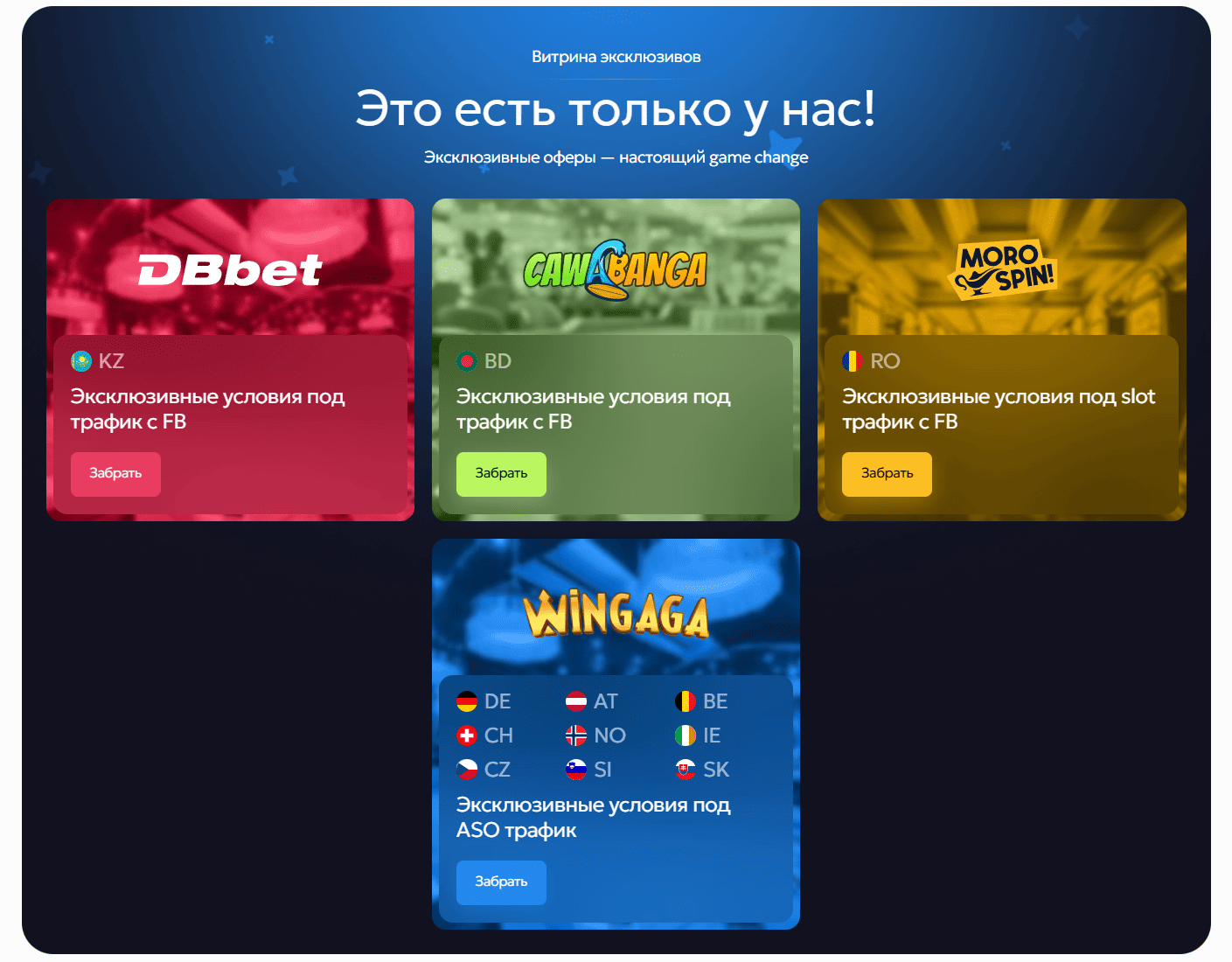 - Витрина эксклюзивов — любой веб-мастер может рассмотреть список эксклюзивных офферов на сайте партнерки, для этого не обязательно писать менеджеру.